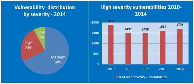 โดยในช่องโหว่ด้านความปลอดภัยทั้งหมดในปี 2014 นี้ พบว่ามีช่องโหว่ระดับร้ายแรงอยู่เป็นจำนวน 1,705 จุด หรือคิดเป็น 24% ของจำนวนช่องโหว่ทั้งหมด ซึ่งคิดเป็นสัดส่วนที่น้อยกว่าในปี 2013 เล็กน้อย