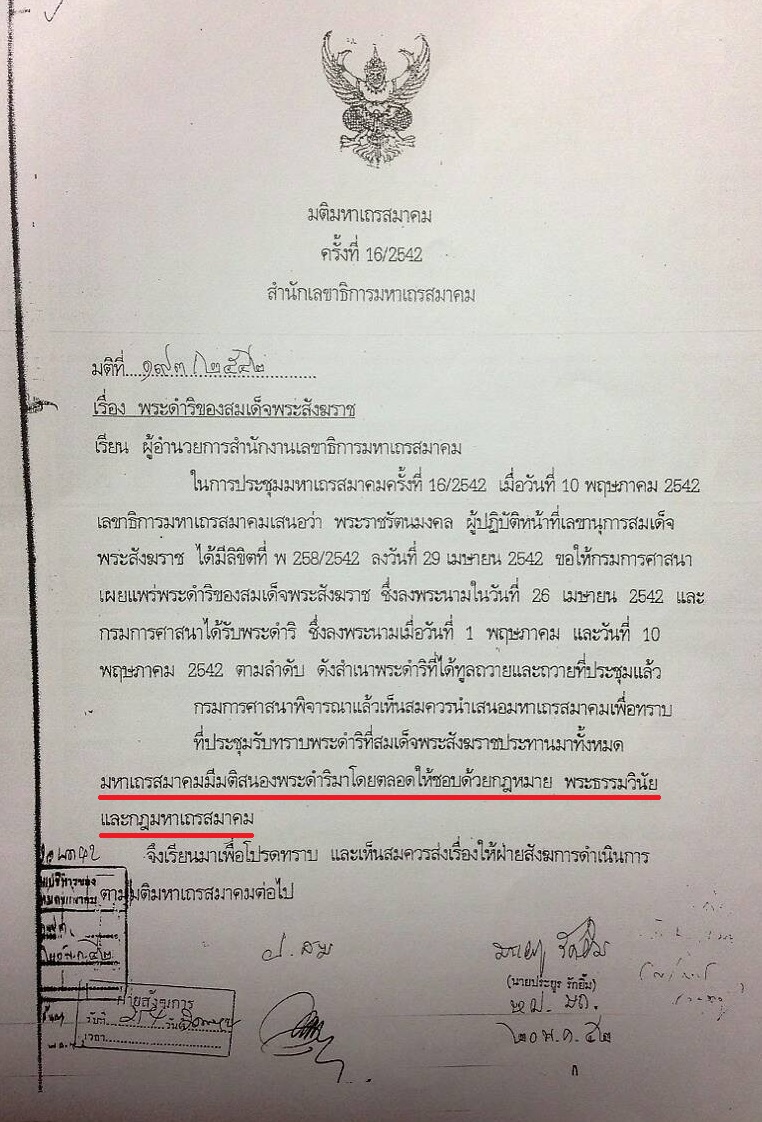 ขออนุญาตนำภาพของสมาชิก คุณทวนทอง มาใช้ประกอบนะครับ..เพราะเป็นฉบับที่ค่อนข้างชัด ภาพนี้คงชัดว่าว่า มติมหาเถรสมาคม มีมติสนองพระดำริ แล้ว ...ชัดว่า ต้องปาราชิกแล้ว ครับ.... เดี๋ยวจะแวะมาอรรถาธิบายเพิ่ม