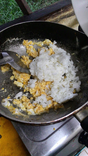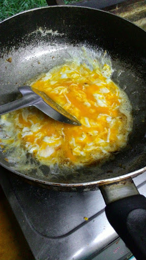 4.รอไข่สุก แต่เอาแบบไม่ต้องสุกมาหนะ เพราะต้องผัดกับข้าวต่อ จากนั้นโยนข้าวลงกะทะไปเลยจ้าาาาาา