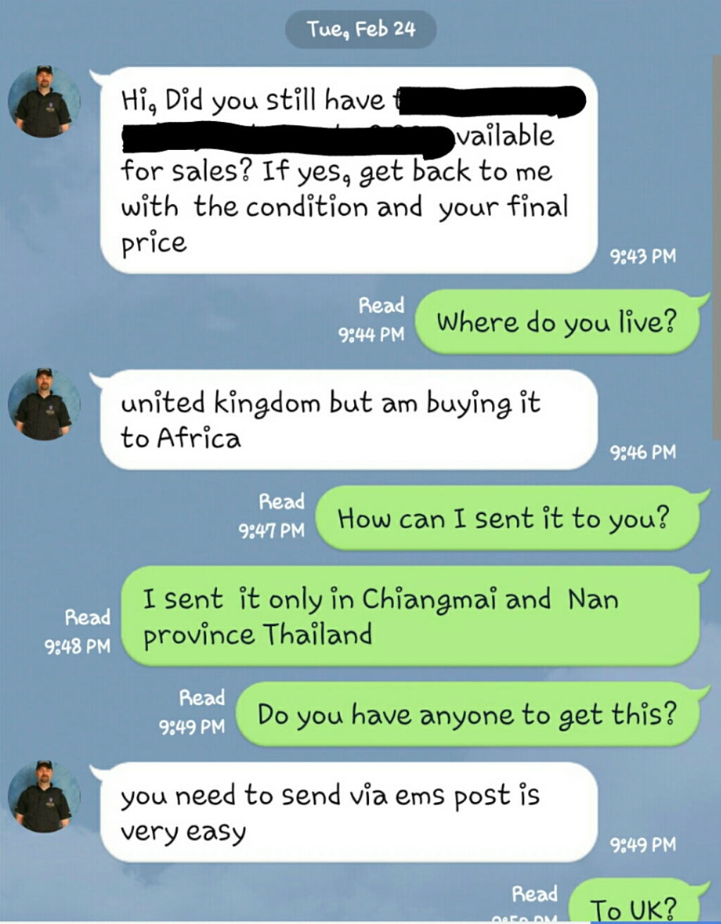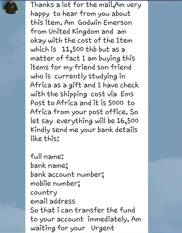 เรื่องมีอยู่ว่า...ลงของประกาศขายในOLX แล้วมีคนต่างชาติอ้างว่าเป็นคนอังกฤษมาติดต่อซื้อของ ขอส่งของไปแอฟริกา ที่อยู่จัดส่งเป็นไนจีเรีย โดยจะโอนเงินมาก่อน พอลองsearchในอินเตอร์เน็ตได้ความว่า...มีเทคนิกหลายทางในการโกง