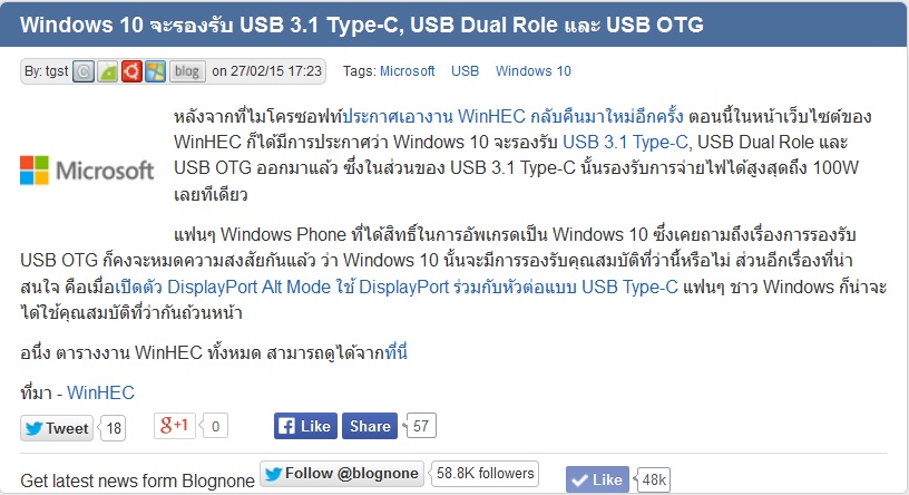 หลังจากที่ไมโครซอฟท์ประกาศเอางาน WinHEC กลับคืนมาใหม่อีกครั้ง ตอนนี้ในหน้าเว็บไซต์ของ WinHEC ก็ได้มีการประกาศว่า Windows 10 จะรองรับ USB 3.1 Type-C, USB Dual Role และ USB OTG ออกมาแล้ว ซึ่งในส่วนของ U