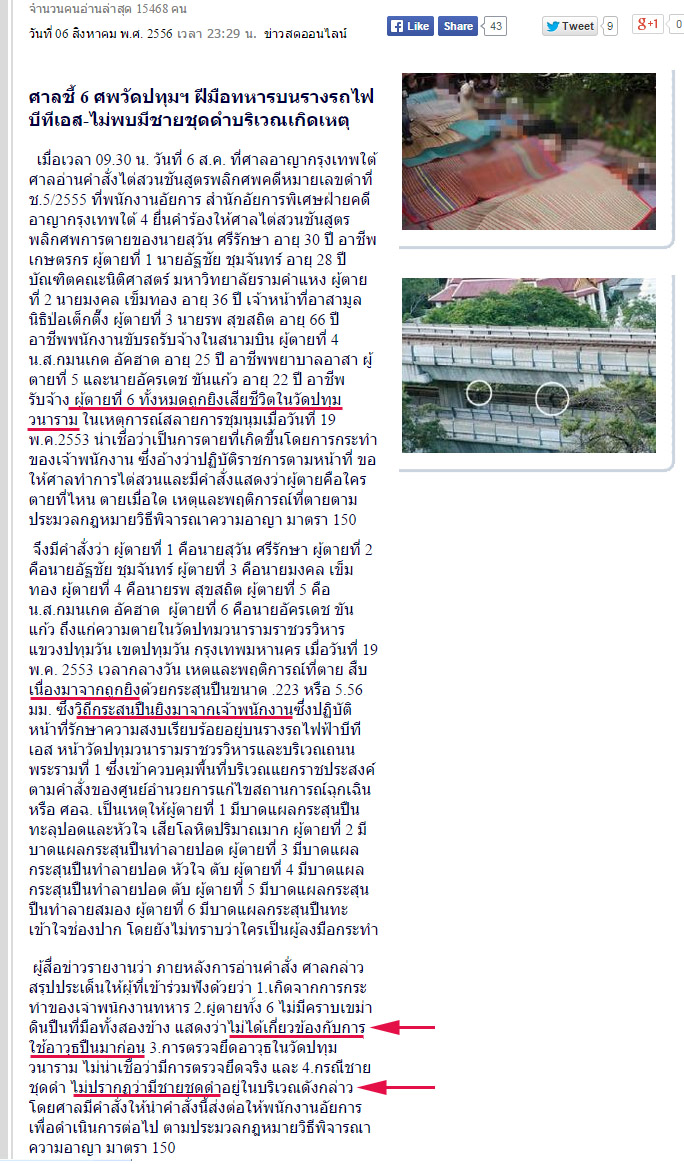 แต่หากผู้บาดเจ็บหรือเสียชีวิตเป็นประชาชนผู้บริสุทธิ์ และที่ไม่ได้ใช้อาวุธกับเจ้าหน้าที่เลย ก็ย่อมต้องถือว่าเกินสมควรแก่เหตุ เกินกว่ากรณีจำเป็นใช่หรือไม่ อภิสิทธิ์และสุเทพแล้วควรต้องชี้แจงแล้วว่าไม่ละเว้นการปฏิบัติหน้าที่ควบคุมแล้วมันเกิดเหตุร้ายแรงเช่นนี้ต่อประชาชนได้อย่างไร และต้องรอดูลิเกตอนต่อไปว่าความยุติธรรมจะมีมากน้อยเพียงไร