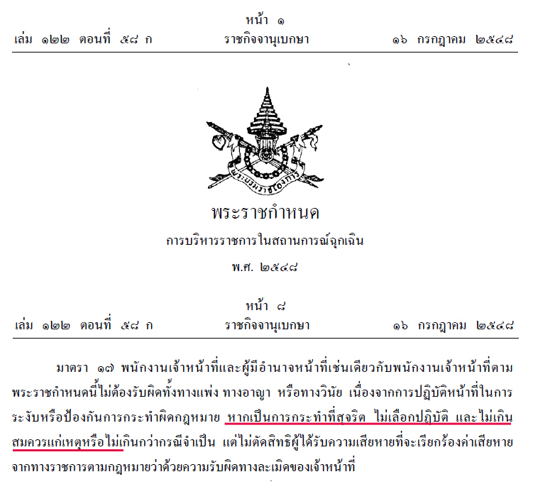 เพราะมาตรา 17 ของพรก.ฉุกเฉินนั้น ให้ความคุ้มครองเจ้าหน้าที่