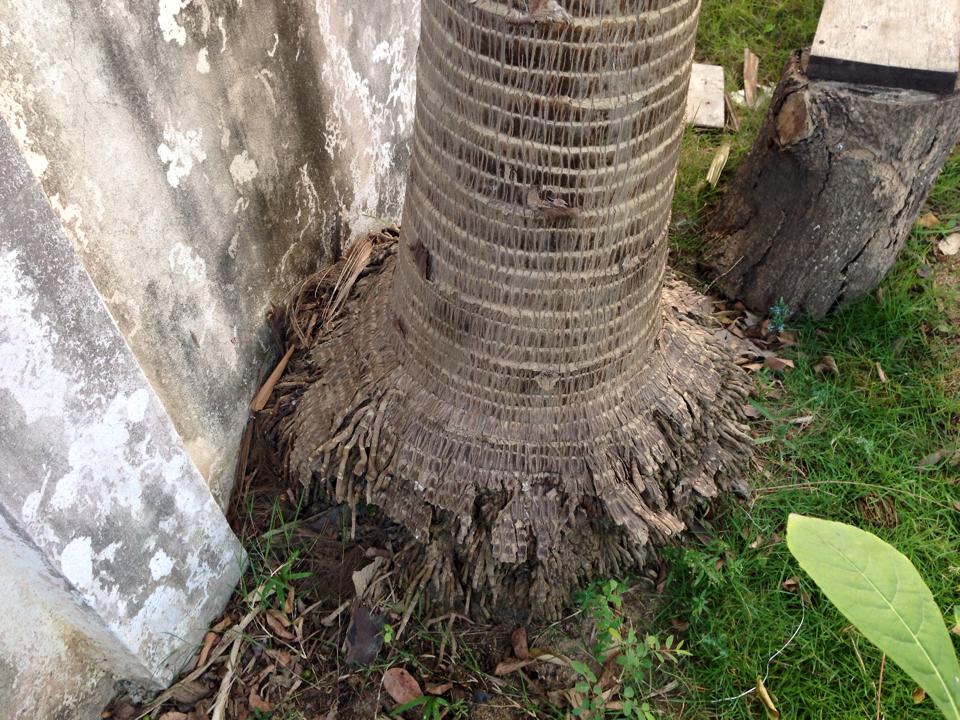 เป็นต้นปาล์มขวดครับ โคนต้นใหญ่เลยทีเดียว และเนื้อเหนียวมาก ไม่สามาถขุดล้อมได้ เพราะอยู่ชิดกำแพงมุมหลังบ้าน+ดินบริเวณนั้นเหนียวมากๆ ผมตัดลำต้นออกไปหมดแล้ว เหลือแต่โคนที่สูงขึ้นมา1เมตร+กอราก ไม่รู้จะถอ