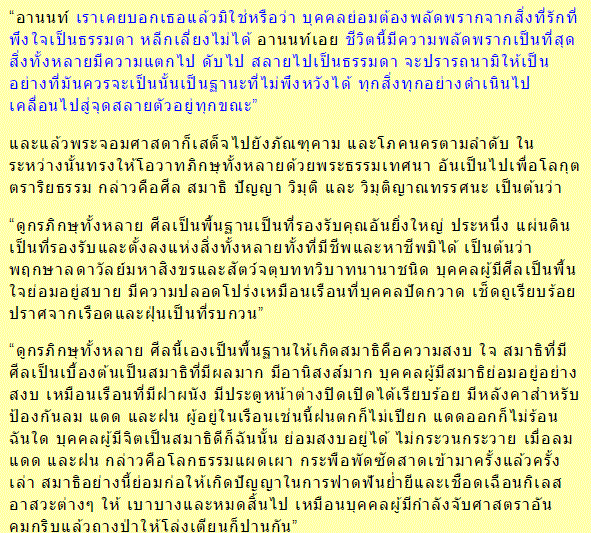 “อานนท์เอย พึงประกาศให้ทราบโดยทั่วกันว่า ธรรมวินัยอันใดที่เราได้แสดงแล้วบัญญัติแล้ว ขอให้ธรมวินัยอันนั้นจงเป็นศาสดาของพวกเธอแทนเราต่อไป เธอทั้งหลายจงมีธรรมวินัยเป็นที่พึ่งเถิด อย่าได้มีสิ่งอื่นเป็นที่พึ่งเลย”
