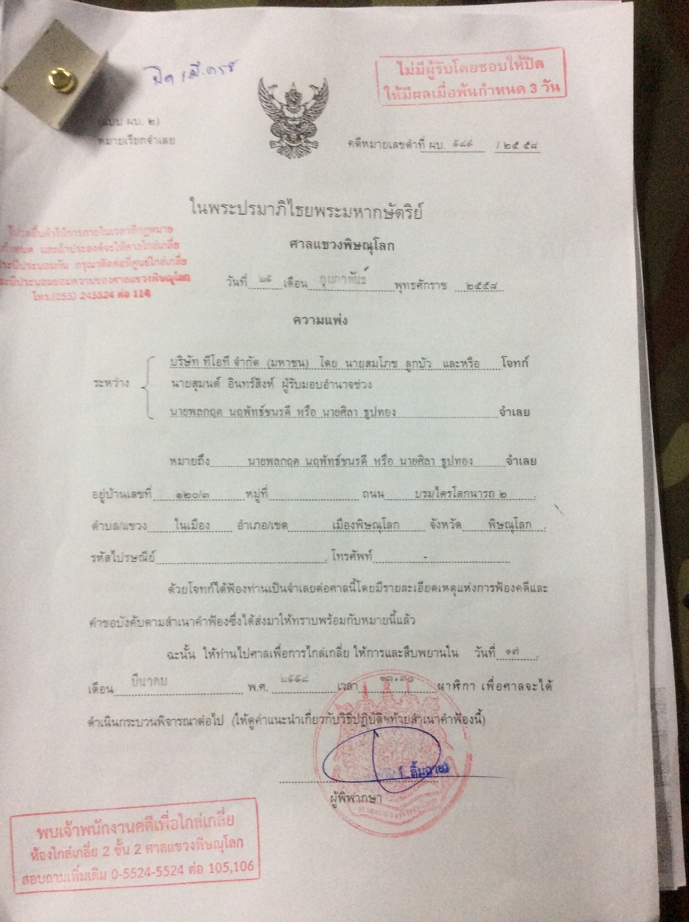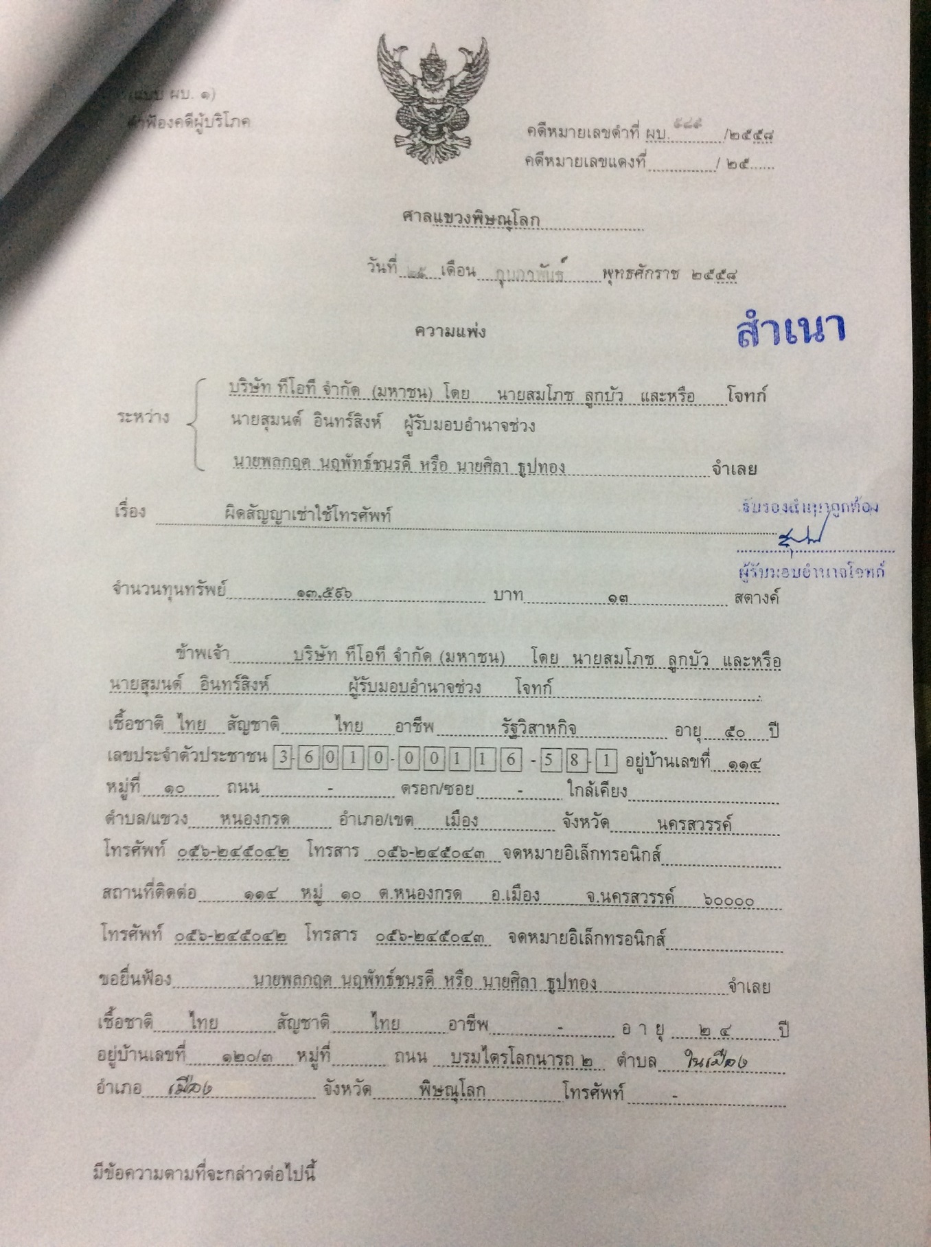 ขออนุญาต ทั้งกระทู้นี้นะครับ เพื่อสอบถามผู้รู้ ขอความเป็นธรรม และ เพื่อเป็นบทเรียนให้แก่ท่านอื่น เนื่องจากผมกำลังโดน บริษัท TOT ฟ้องให้ชำระค่าบริการโทรศัพท์เป็นจำนวนเงิน 12,500 บาท ซึ่งแพ็กเกตตามใบสมัครที่ผมกรอกคือ Load Gold 350 ในวันที่ 16 ส.ค. 2555 หลังจากนั้น บิลจากบริษัทก็ส่งมาให้ชำระค่าบริการตามปกติ แต่ค่าบริการทั้งหมดคือ 7,299.36 บาท บิลออก ณ วันที่ 1 ก.ย. 2555 , เดือนต่อมา มียอดที่ต้องชำระ 3,092.65 บาท บิลออก ณ วันที่ 1 ต.ค. 2555 และเดือนต่อมามียอดที่ต้องชำระ 2,108.84 บาท บิลออก ณ วันที่ 1 พ.ย. 2555 ซึ่งรวมทั้ง 3 เดือน มีจำนวนที่ต้องชำระ 12,500.85 บาท (ในบิลทั้ง3 เดือน ยอดที่ใช้เรียกชำระเงิน กลายเป็นเรียกเก็บจาก โปรโมชั่น LOADUNIMITED 890 และที่แปลกอีกอย่างคือ ใบที่เรียกเก็บยอดรวมทั้ง 3 เดือนล่าสุด กลับขึ้นมาว่าเป็น โปรโมชั่น PERFECT STO7M 990 ตกลงจริงๆแล้วบริษัทจะให้ผมใช้อันไหนกันแน่) ซึ่งไม่ใช่ว่าผมไม่มีเงินจ่าย แต่รู้สึกไม่เข้าใจว่าทำไมค่าโทรศัพท์ถึงเยอะขนาดนี้ ตั้งแต่ในเดือนแรก และผมก็ได้โทรสอบถามกับทางบริษัท ทาง Call Center แล้ว ซึ่งพนักงานบอกแต่เพียงว่า จะติดต่อกลับมาภายหลัง ผมก็เลยยังรอคำตอบ และก็ถามมาทุกเดือน พนักงานก็โยนให้ติดต่อ ทางนู้นทางนี้ ไม่ได้ชี้แจงรายละเอียด ผมจึงตัดสินใจเลิกใช้ และเรื่องก็เงียบไปไม่ได้รับการติดต่อจากทางบริษัท จนกระทั่ง วันที่ 25 กุมภาพันธ์ 2558 ได้มีหมายศาล ได้ไปไกล่เกลื่ย วันที่ 17 มีนาคม 2558 โดยมีจำนวน ทุนทรัพย์ ที่ใช้ฟ้องผม จำนวน 13,596.13 บาท จึงอยากให้เพื่อนๆหรือผู้รู้ ช่วยหาทางออกให้ผมที ว่าควรทำอย่างไร?