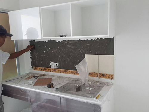 จากนั้นเราอยากปูกระเบื้องตรงผนัง ในส่วนซิงค์ล้างจานค่ะ หาช่างเอง หายากมาก ช่างเรียกแพงด้วย พื้นที่นิดเดียว คิดตั้ง 4,500 สุดท้าย เราให้พี่ชายช่วยหาช่าง แล้วอ่านเอาในพันทิพย์นี่แหละ ว่าปูกระเบื้องใช้อะไร แล้วขับรถไปโฮมโปรเลยจร้า ซื้อของเอง เลือกเอง ใช้ตลับเมตรวัดแล้วคำนวณเอาเองเลยว่าใช้อะไรเท่าไหร่ สุดท้ายไปพาช่างมาติดให้ เสียค่าจ้างไป 1,200 บาท (555 ภูมิใจ)