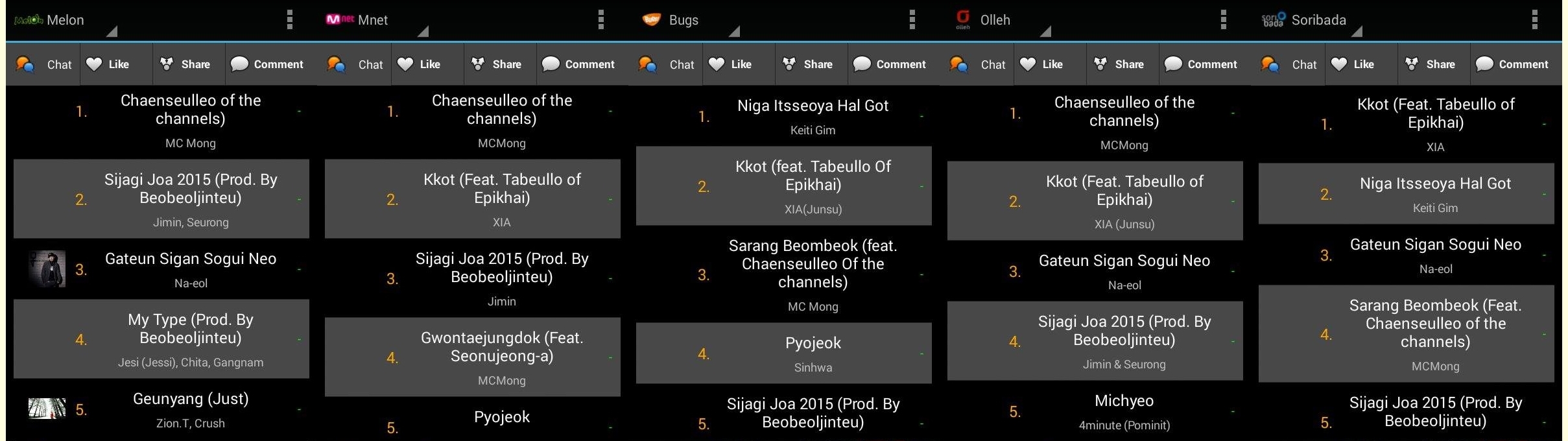 รวมชาร์ตเพลง 5 ชาร์ตหลัก ประจำวันที่ 15/07/2015 อิงจาก 5 ชาร์ตหลักของเกาหลี ได้แก่ Melon Mnet Bugs Olleh และ Soribada สำหรับการ All Kill ในความหมายของการรายงานชาร์ตนี้คือ ขึ้นที่ 1 ชาร์ตเพลงประจำวัน