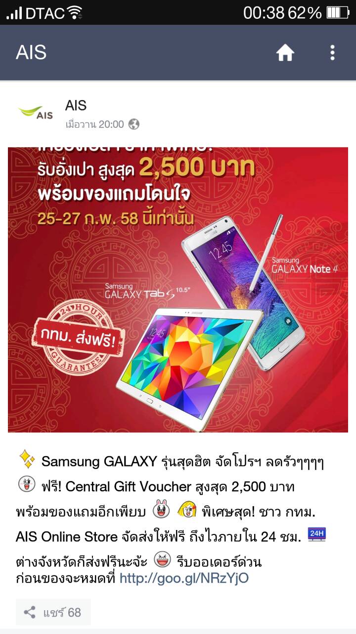 สั่งซื้อแทบเล็ตซัมซุง Tab S 10.5 จาก AIS online store แล้วไม่ได้รับของสมนาคุณตามที่กล่าวไว้...ทำไมไม่ทำตามสัญญาคะ