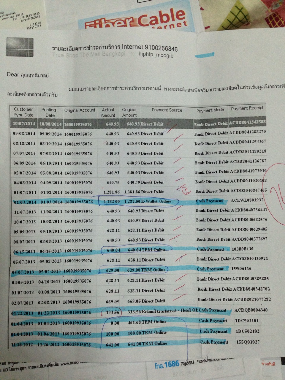 ไม่เคยให้มีการตัดค่า internet ผ่านบัตรเครดิต แล้วพนักงานก็บอกว่าก็จ่ายเป็นเงินสดอยู่แล้ว ทีนี้พอได้บิลมาหลังจากนั้น ได้นำบิลไปจ่ายที่เคาเตอร์