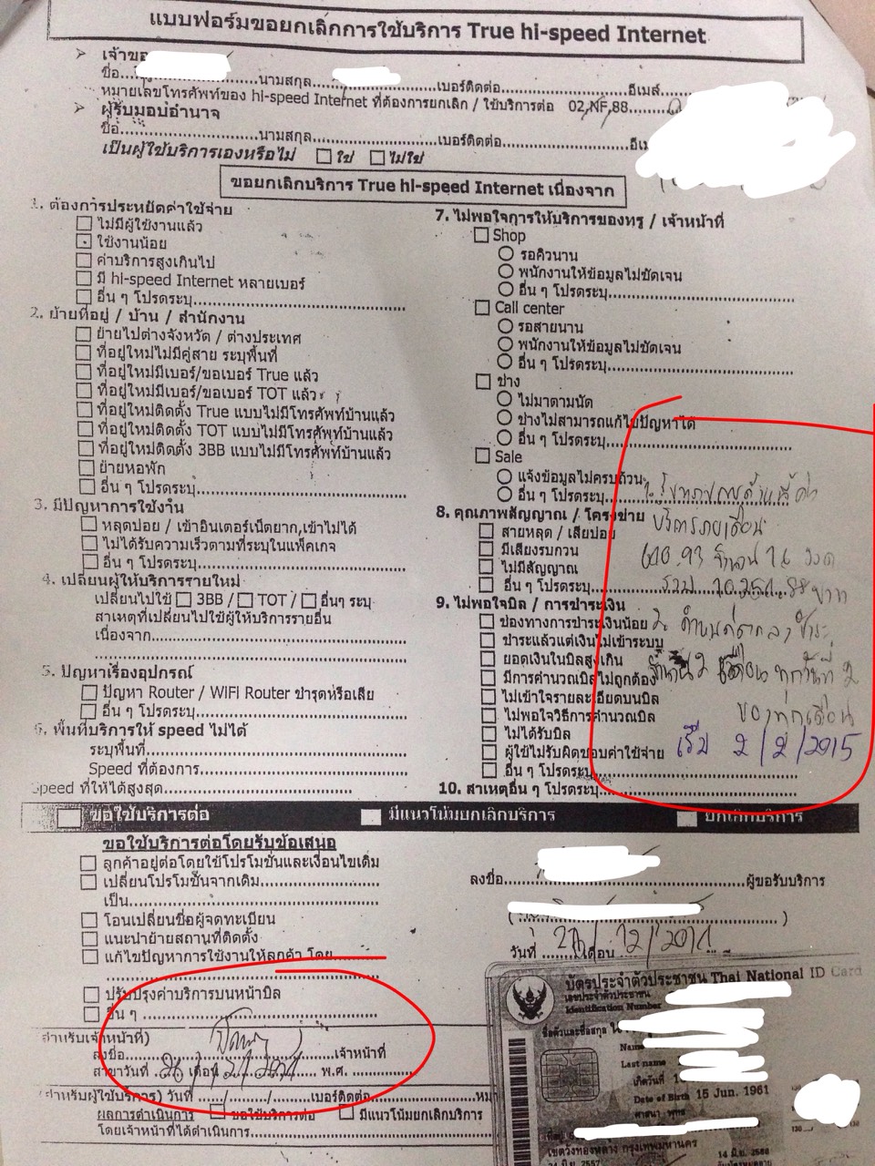 วันนึงก็มีโทรศัพท์มาจากผู้จัดการ True สาขา the mall บางกะปิว่า เนื่องจากทางบริษัทตัดบัตรเครดิตผิด account จึงขอเก็บ internet ที่ผ่านมากับทางน้าของเรา ครั้งแรกที่โทรมาบอกว่ามียอดค้าง 6000กว่าบาท ถ้าไม่จ่ายจะตัดสํญญาณ internet น้าจึงบอกให้ส่งเอกสารมาที่บ้าน แต่ผ่านไปก็ไม่มีการส่งเอกสารมา น้าจึงได้ไปหาผู้จัดการที่ the mall 2ครั้ง แต่พนักงานบอกผู้จัดการไม่อยู่และไม่ได้รับการติดต่อกลับมาเลย ครั้งที่3 ไปหาเหมือนเดิม พนักงานไปตามกว่าครึ่งชั่วโมงก็ไม่ยอมออกมา น้าจึงโทรหามือถือผู้จัดการ ว่าทำงานรึเปล่ารออยู่ข้างนอกแล้วให้ออกมาพบที หลังจากนั้นผู้จัดการจึงออกมา ทีนี้ผู้จัดการบอกว่า ไม่ใช่ 6000กว่าบาทแต่เป็น 10000 กว่าบาทแล้ว ผู้จัดการให้จ่ายเป็น 2 งวด งวดละ 5000 กว่าบาท น้าเราบ่นกับผู้จัดการว่าเขายินดีที่จะจ่ายทั้งที่ไม่ใช่ความผิดของเขานะ แต่น้าเราจ่ายไม่ไหวเพราะเป็นเงินก้อน เลยขอผ่อนชำระเป็นงวดในราคาที่เท่ากับค่า internet คือ internet ราคา 600กว่าบาท น้าจะจ่ายเพิ่มเป็น 1200 บาท ทั้งหมด 16 งวด