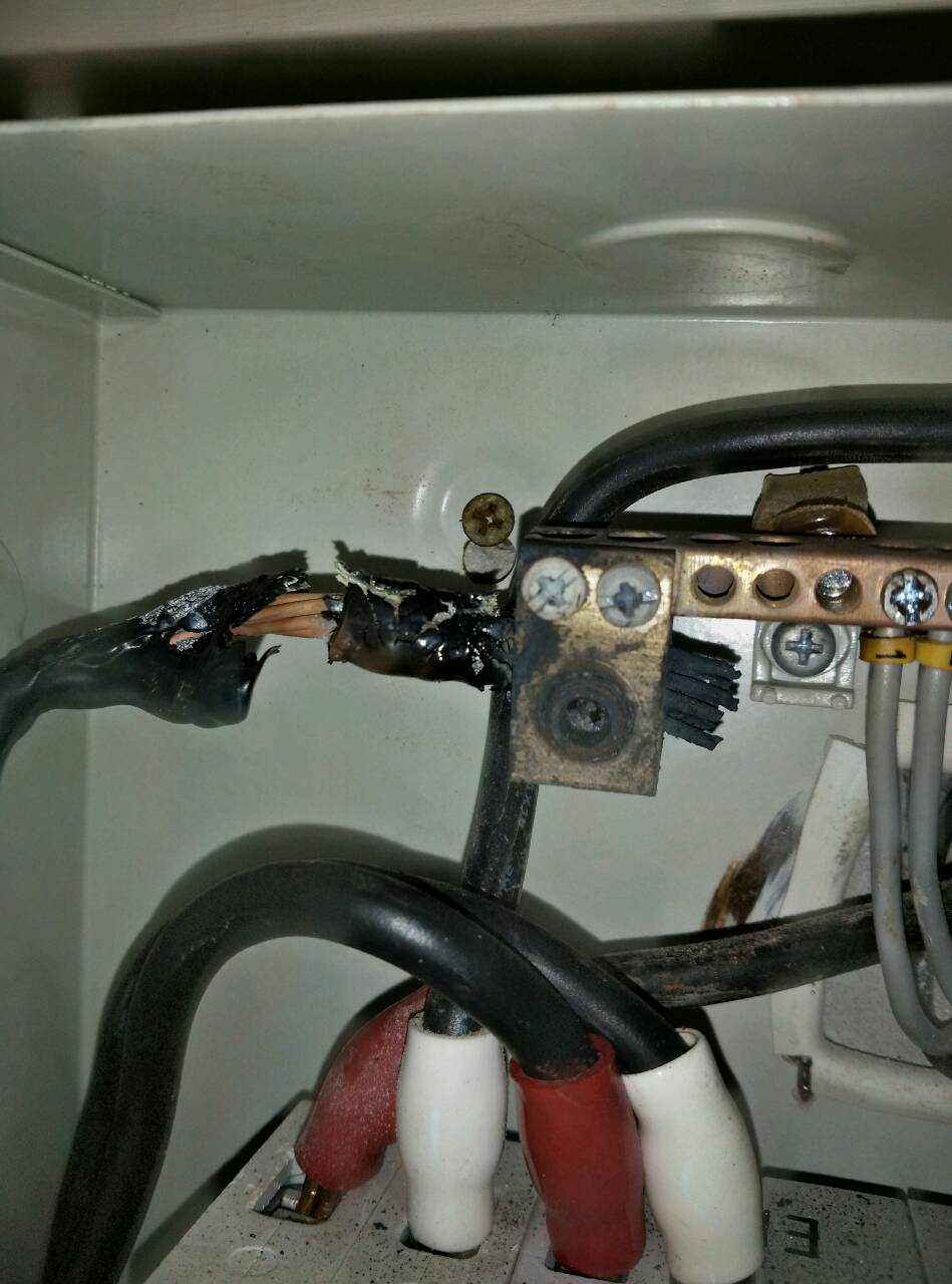 พอวันพุธตอนเย็นๆ ลองเปิดตู้ไฟดู กะว่าจะขันให้แน่น พอเปิดออกมาดูเจอสภาพนี้แล้วครับ เลยรีบสับเบรกเกอร์ลง อีกซักพักมีเรื่องให้ต้องใช้ไฟฟ้า เลยกะว่าลองดูแปปนึง ทั้งวันก็ยังใช้มาได้ สับเบรกเกอร์ขึ้น มีควันขึ้นเลยครับ มีเสียงสปาร์ค ซักพักมีเสียงไฟช๊อตแรงๆ เลยรีบปิดทันทีครับ