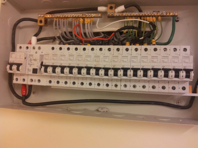 ไม่กล้าทำเอง เรียกช่างมาซ่อมชั่วคราวไปก่อนครับ ช่างตัดสายไฟส่วนที่ไหม้ออก เอาตัวยึดสายไฟออก แล้วต่อเข้ากับ N Bar ไปก่อน รอสายไฟเส้นใหม่ กับตัวยึดมาเปลี่ยน จากรูปนี่ พอสายไฟออกจาก N Bar ไปแล้ว ก็ไปเข้าที่ตัวกันดูด RCCB ตามรูปครับ ต่อเหมือนเดิม