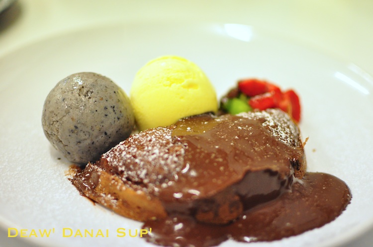 ถังแตกลาวาจะมาชิ้นหนากว่าปกติครับ เพราะต้องมีใส้ไหลด้านใน ผมไปยืนดูพี่เค้าทำอยู่ครับ เค้าอบช็อคลาวาแล้วจะหั่นครึ่งให้ช็อคลาวามันไหลออกมาครับ ส่วนอีกครึ่งนึงเค้าก็ทิ้งเลย (ในกรณีที่ไม่มีออเดอร์เพิ่มมา แต่ถ้ามีออเดอร์เหมือนกันก็สามารถเก็บอีกครึ่งให้อีกออเดอร์นึงได้ครับ) เมนูนี้ผมสั่งมาทานกับไอศครีมงาดำและวนิลาครับ ปกติผมจะสั่งกล้วยมาทานด้วย แต่วันนี้อิ่มมากตั้งแต่จุ่มแล้ว อัดถังแตกไปอีกก่อนห้าหนึ่งชิ้นเลยจุกมากๆ