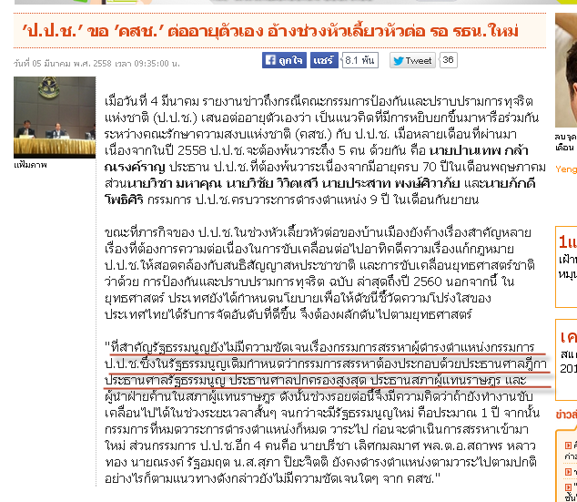 ′ป.ป.ช.′ ขอ ′คสช.′ ต่ออายุตัวเอง อ้างช่วงหัวเลี้ยวหัวต่อ รอ รธน.ใหม่ เมื่อวันที่ 4 มีนาคม รายงานข่าวถึงกรณีคณะกรรมการป้องกันและปราบปรามการทุจริตแห่งชาติ (ป.ป.ช.) เสนอต่ออายุตั