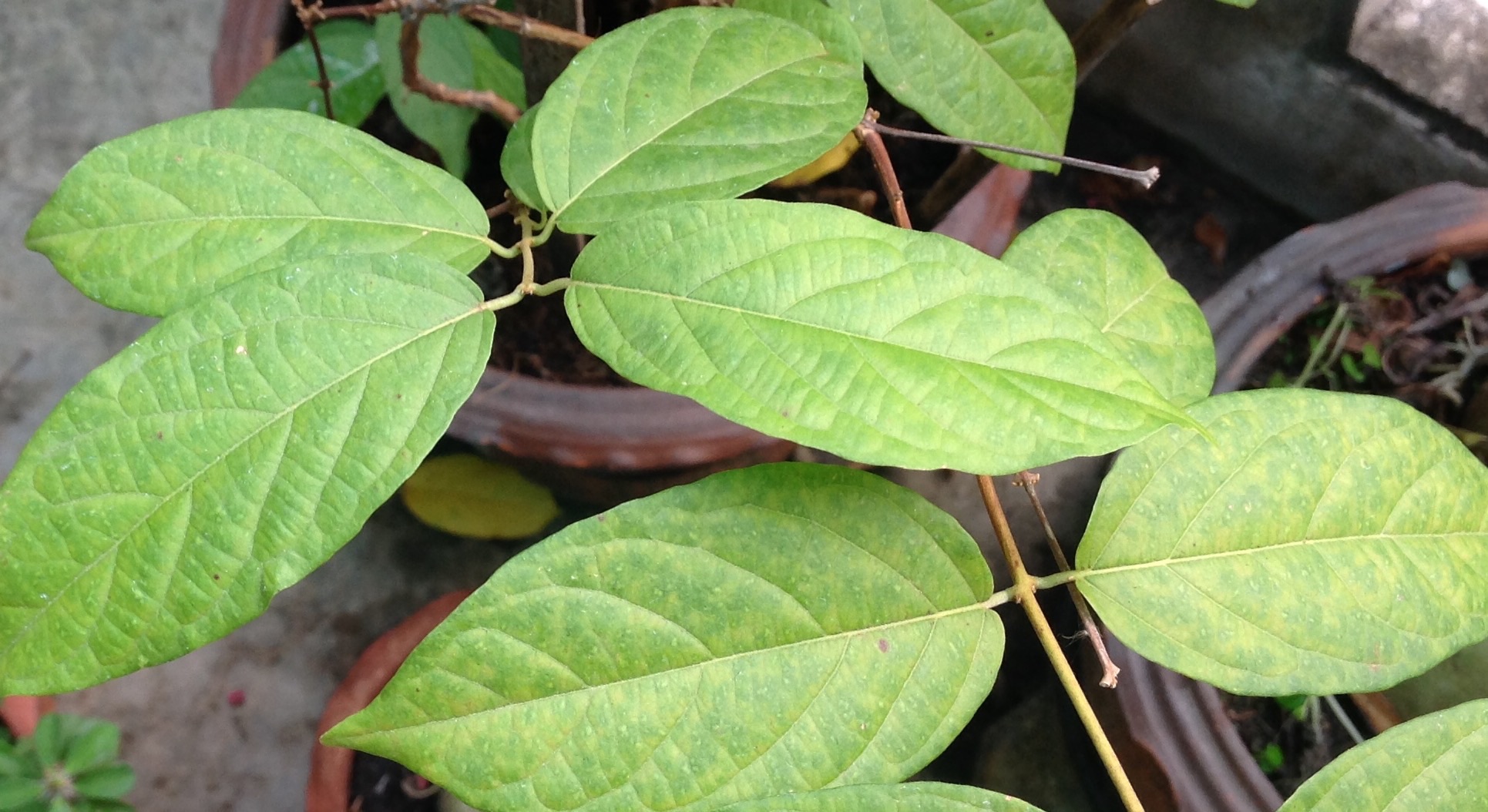 ใบค่อยๆเปลี่ยนจากสีเขียวเป็นสีเหลือง. โดยจะเริ่มมีอาการ สีเขียวเริ่มลดลง สีเหลืองเริ่มเข้ามาแทน และก็มากขึ้นจนเป็นสีเหลืองทั้งใบ และก็ใบร่วงไป