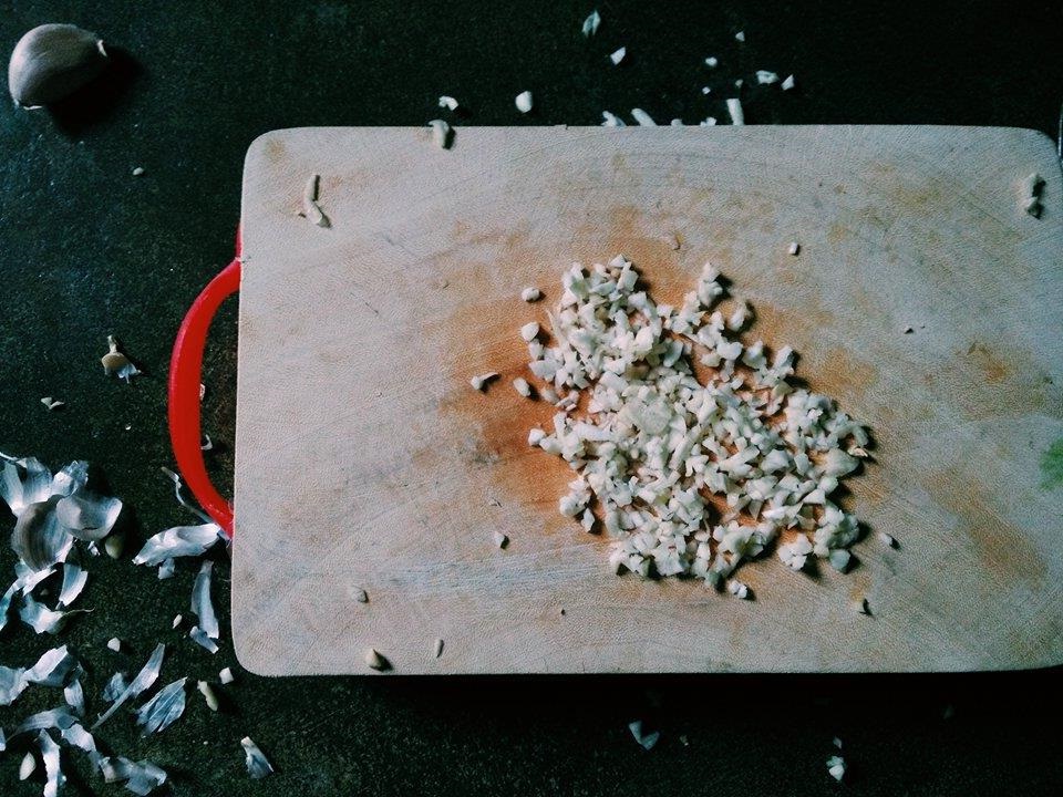 เริ่มด้วย การสับกระเทียม เราเอามา 3กรีบ ปลอกเปลือก สับให้ละเอียด กะปริมาณกระเทียมเอาต้องดูปริมาณของเนยควบคู่ไปด้วย ใครชอบกลิ่นหอมฉุนก็เอามาสับเยอะๆ อย่าตำหรือบี้กระเทียมก่อนนะจะได้คงความหอมของระเทียมไว้ เราเฉือนบางๆแล้วสับๆๆๆๆ
