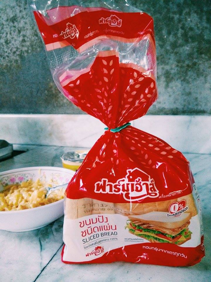 ตั้งกระทะเปิดไฟไว้ก่อนที่ใช้กระทะเนี่ย เพราะที่บ้านไม่มีเตาอบขนมปังค่า5555 ใช้แบบบ้านๆนี่หล่ะทุกบ้านมีอยู่แล้ว ระหว่างรอตั้งกระทะให้มันร้อนๆก็ทำขั้นตอนต่อไปควบคู่ไปกับการรอ หยิบขนมปังมาทาหน้าเลย เราเลือกใช้ฟาร์มเฮาท์ ขนมปังที่นิยมกันทั่วบ้านทั่วเมือง เดาเอา55 แต่ก็น่าจะจริงนะ