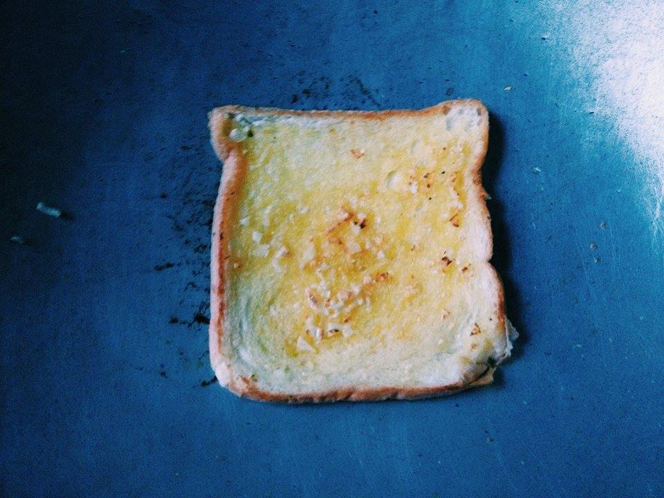 จากนั้นเอาลงกระทะ เราเอาหน้าที่ทาเนยกระเทียมลงก่อน เราใช้ตะหลิวกด เพราะทรงกระทะเป็นหลุมไม่ใช่ทรงแบน ทิ้งไว้ในกระทะ1-2นาที แล้วแต่ว่าอยากได้เกรียมไม่เกรียม