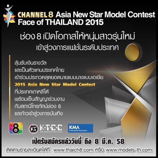 หาตัวแทนนางแบบนายแบบจากประเทศไทย ไปแข่งขันบนเวทีระดับนานาชาติในงาน Asia Model Festival 2015 ที่ประเทศเกาหลี พร้อมโอกาสในการเซ็นสัญญาร่วมงานกับช่อง 8 และก้าวเข้าสู่วงการบันเทิง