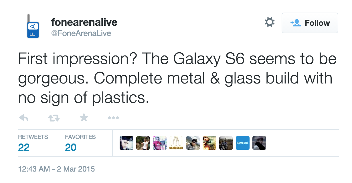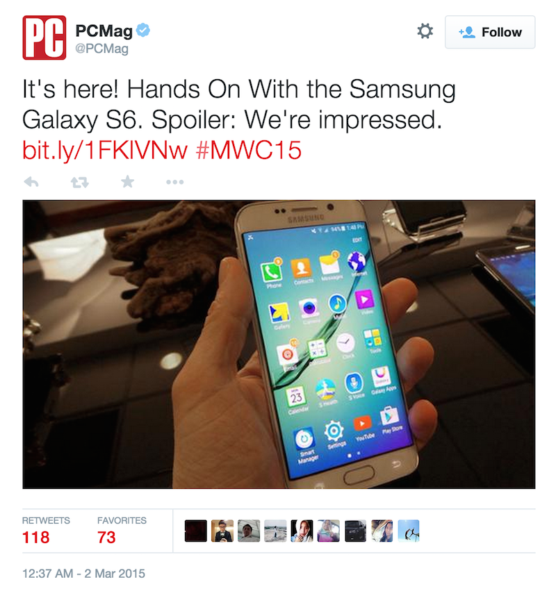 PC Mag อีกหนึ่งสื่อด้านเทคโนโลยียุคแรกๆ ทวีตว่า “มาแล้ว! Samsung Galaxy S6, สปอยส์นะ: เราประทับใจ”