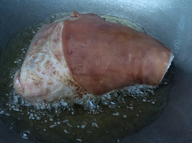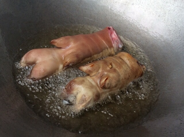 2. ตั้งกระทะ พอร้อนใส่น้ำมัน พอน้ำมันร้อนก็นำขาหมูลงทอดพอเหลืองพักไว้