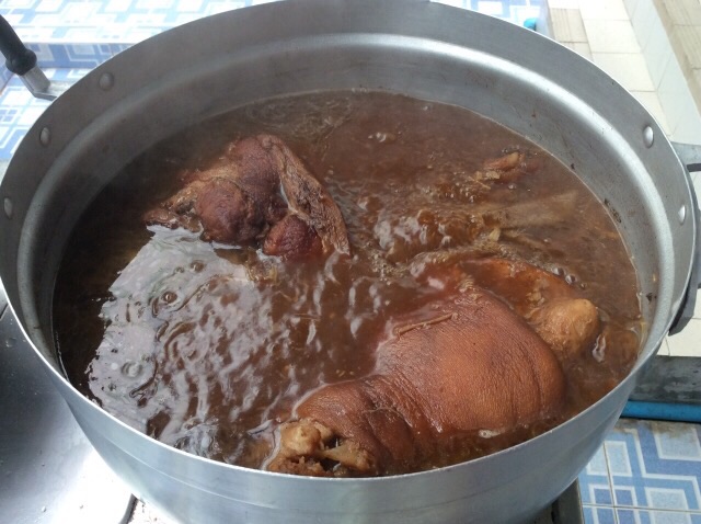 4. เติมเครื่องปรุงลงไปเคี่ยวให้เดือด ใส่ขาหมูคลุกเคล้าให้ทั่ว
