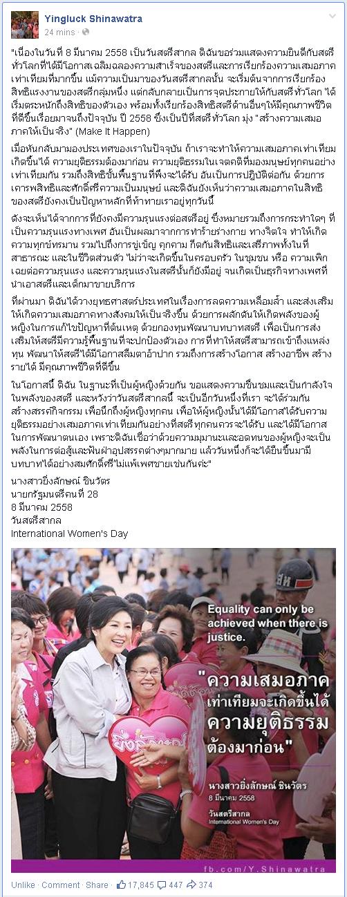 ปู : ขอร่วมแสดงความยินดีกับสตรีทั่วโลกที่มีโอกาสเฉลิมฉลองความสำเร็จของสตรีและการเรียกร้องความเสมอภาคเท่าเทียมที่มากขึ้น