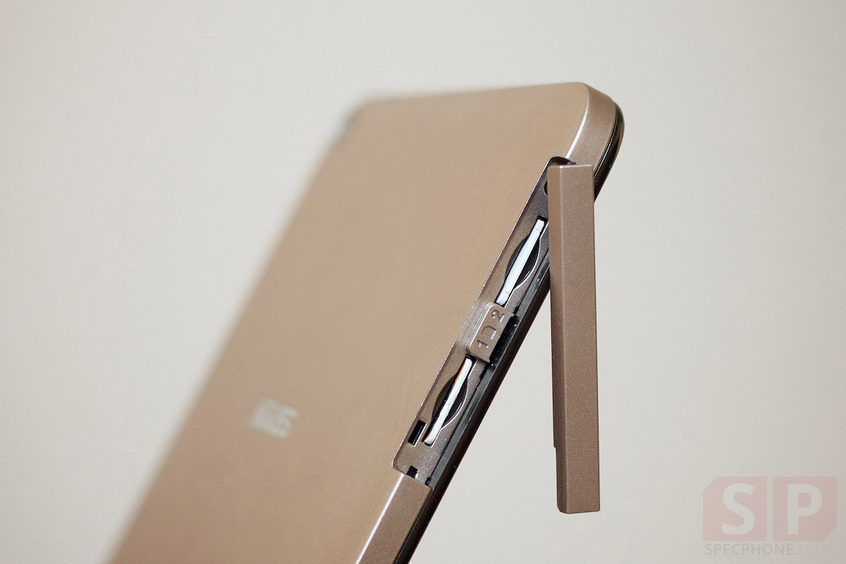 ด้วยการที่ออกแบบให้ฝาหลังไม่สามารถแกะออกได้ ทำให้ต้องปรับเปลี่ยนให้ช่องใส่การ์ดต่างๆ มาอยู่ด้านข้างเครื่องทั้งหมด ไล่จากฝั่งซ้ายของจอที่มีช่องใส่ไมโครซิมทั้งสองซิมซ่อนอยู่ใต้ฝาปิด ด้านล่างก็มีช่องใส่ MicroSD อยู่ (ไม่มีฝาปิด) ฝั่งขวาก็มีแถบของปุ่มเพิ่ม/ลดเสียง และปุ่ม Power วางอยู่ในตำแหน่งที่สามารถใช้นิ้วหัวแม่มือขวากด ในขณะที่ถือเครื่องด้วยมือขวาได้แบบไม่ลำบากมากนัก ส่วนช่องเสียบแจ็คหูฟัง กับช่อง Micro USB จะอยู่ที่ด้านบนของเครื่องทั้งหมด ผลเลยออกมาเป็นว่าฝาหลังดูเรียบเนียนไปหมด มีจุดดึงสายตาอยู่ที่กล้องหลังซึ่งติดตั้งไว้ตรงมุมบนสุดเลย ดีที่ตัวกล้องแทบจะไม่นูนขึ้นมาเหนือฝาหลังเลย ทำให้สามารถใช้งานได้สะดวก ไม่ต้องคอยระวังมากนัก