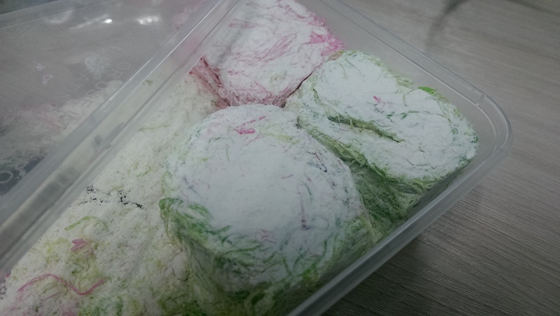 ขนมดูเหมือน เส้นสลิ่มคลุกด้วยแป้ง