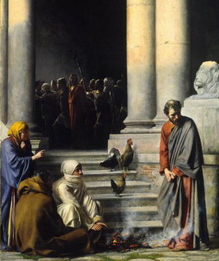 ทันใดนั้น ประตูห้องโถงเปิดออก เปโตรวิ่งออกมาและร้องไห้อย่างขมขื่น ด้วยแสงของใต้(คบเพลิง) เขาเห็นและรับรู้ว่ายอห์นและพระแม่ก็อยู่ที่นั่นด้วย มโนธรรมของเขาติเตียนอย่างหนัก โดยการทอดสายตามองของพระเยซูเจ้า และบัดนี้เขาตัวสั่น เมื่อพระแม่พูดกับเขาว่า “ซีโมนเอ๋ย ลูกของแม่เป็นอย่างไร? พระเยซูเจ้าเป็นอย่างไรบ้าง?”