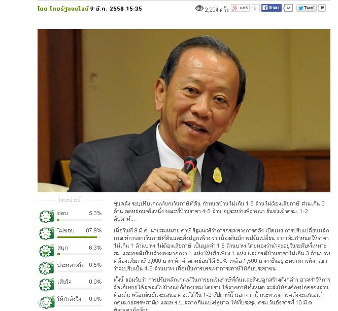 http://www.thairath.co.th/content/485839 ขุนคลัง ระบุปรับเกณฑ์ยกเว้นภาษีที่ดิน กำหนดบ้านไม่เกิน 1.5 ล้านไม่ต้องเสียภาษี ส่วนเกิน 3 ล้าน ลดหย่อนครึ่งหนึ่ง ขณะที่บ้านราคา 4-5 ล้าน อยู่ระหว่างพิจารณา