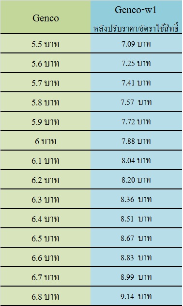 ราคาของ Genco เทียบ Genco-w1 ควรเป็นตามตาราง