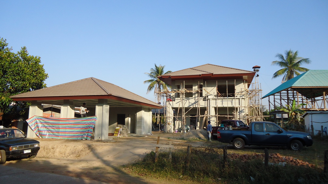 ๑. หลังจากหมดฤดูทำนา ช่างก็เริ่มเข้ามาทำงานกันต่อ จนทั้งบ้านและโรงจอดรถเป็นรูปเป็นร่างขึ้นมาละ
