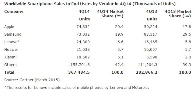 จากรายงานพบว่าในไตรมาสที่ 4 ของปีที่ผ่านมา Apple ได้จำหน่ายสมาร์ทโฟนไปแล้วทั้งสิ้นกว่า 74.83 ล้านเครื่อง(flagship) ในขณะที่ Samsung จำหน่ายไปได้กว่า 73.03 ล้านเครื่อง(สากกระเบือยันเรือรบ) และเหตุการณ์ดังกล่าวทำให้ Apple เป็นแชมป์ได้ในไตรมาสนี้