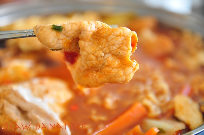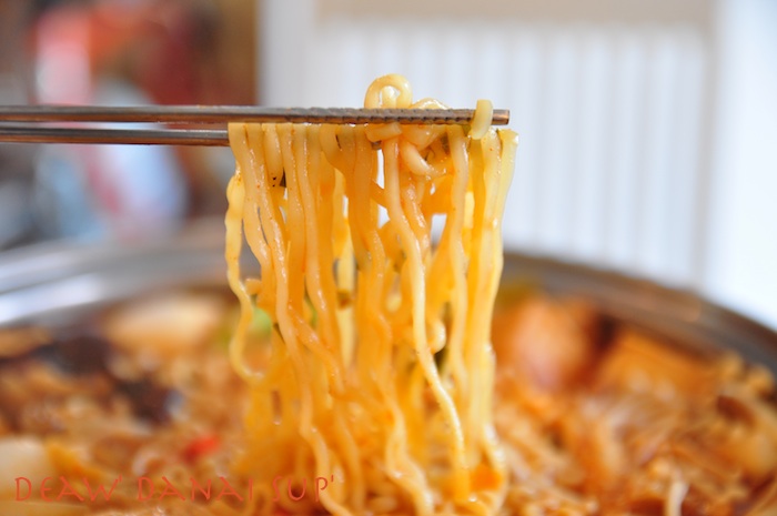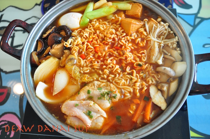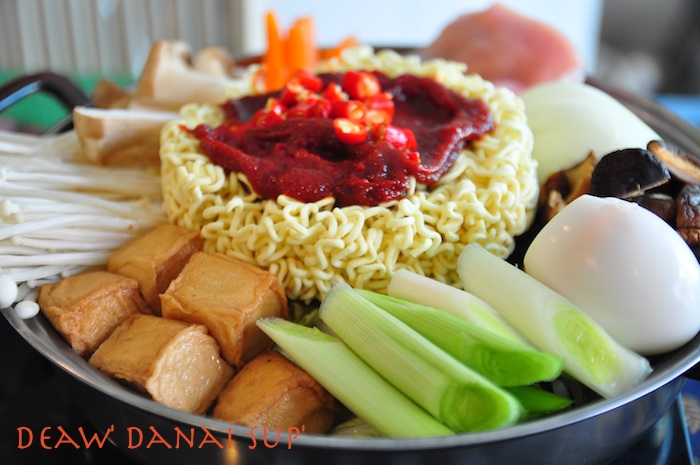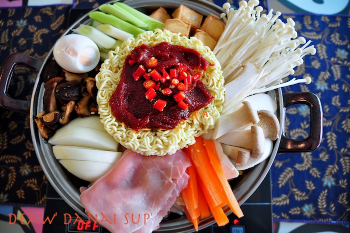 ผมเลยจัดการทำเองซะเลย ซื้อผักปลอดสารทั้งเห็ดเข็มทอง เห็ดหอม เห็ดออรินจิ แครอท หอมใหญ่ ต้นหอมญี่ปุ่น เต้าหู้ปลา ผักกาดขาว ไข่ต้ม พริกสด หมูสไลด์อนามัย และมาม่าเกาหลี เริ่มจากทำน้ำซุปก่อนครับแล้วพักไว้ หั่นผักที่ซื้อมา หั่นๆๆๆๆ ต้มไข่รอให้พร้อม วางผักกาดขาวรองก้นหม้อไว้ แล้วจัดเรียงวางผักและเห็ดที่หั่นให้สวยงาม แล้วใส่เครื่องปรุงมาม่าเกาหลีที่ให้มา โปะหน้ามาม่าด้วย โคชูจัง น้ำพริกเผาสีแดงๆซึ่งที่บ้านมีอยู่แล้วครับ (แต่ที่ร้านน่าจะใช้แดซังเต้าเจี้ยวเดนจัง ที่ออกสีนำตาลเข้มๆอะครับ แต่ก็แทานกันได้เหมือนกัน) ใส่พริกสดเพิ่มความเผ็ดร้อน เทน้ำซุป ตั้งไฟให้ร้อน รอให้สุกก็พร้อมทานแล้วครับ