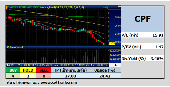 บล.เมย์แบงก์ กิมเอ็ง ระบุในบทวิเคราะห์ (2 มี.ค.) ว่า ปรับลดประมาณการสะท้อนถึงผลประกอบการต่ำกว่าคาด ราคาเนื้อสัตว์ปรับตัวลดลง และ ธุรกิจต่างประเทศฟื้นตัวช้ากว่าคาด อย่างไรก็ดี คาดว่ากำไรปียังเติบโตจากปีก่อน เนื่องจากธุรกิจกุ้งมีแนวโน้มฟื้นตัว การส่งออกไก่เพิ่มขึ้น ราคาวัตถุดิบอาหารสัตว์ลดลง อีกทั้งคาดส่วนแบ่งกำไรจาก CPALL เพิ่มขึ้นยังคงคำแนะนำ ซื้อ CPF โดยปรับลดราคาเป้าหมาย (SOTP) ลงจาก 39 บาท เป็น 32.75 บาท (ประกอบด้วย CPF 14.08 บาท และ CPALL 18.68 บาท)