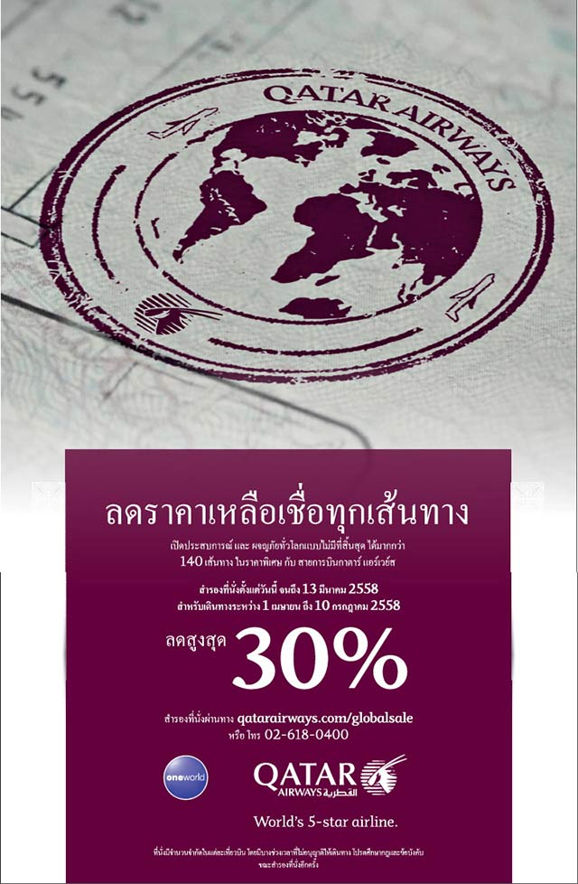 สายการบินกาตาร์ แอร์เวย์สเปิดตัวแคมเปญ “A World of Fabulous Fares” ตั้งแต่วันนี้ – 13 มีนาคม 2558 มอบส่วนลดสูงสุดถึง 30% จากราคาบัตรโดยสารไป-กลับ สู่จุดหมายปลายทางในตะวันออกกลาง ยุโรป เอเชีย แปซิฟิก และอเมริกา สำหรับการเดินทางระหว่าง 1 เมษายน ถึง 10 กรกฎาคม 2558