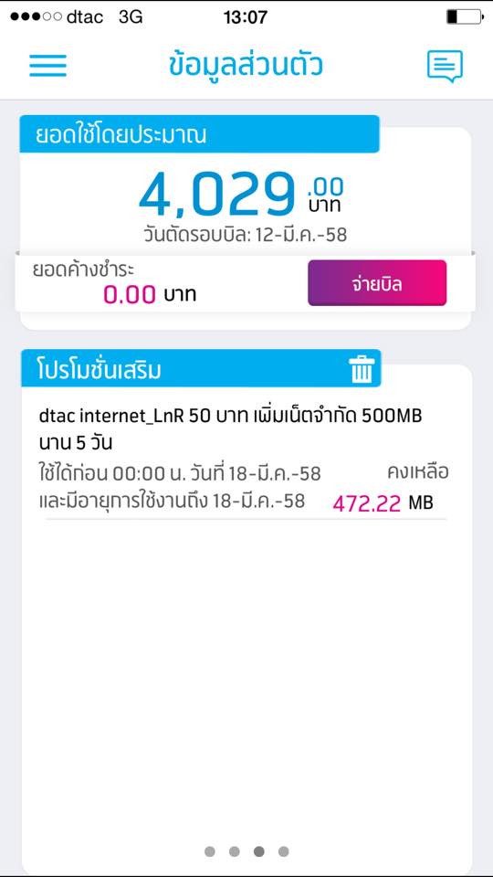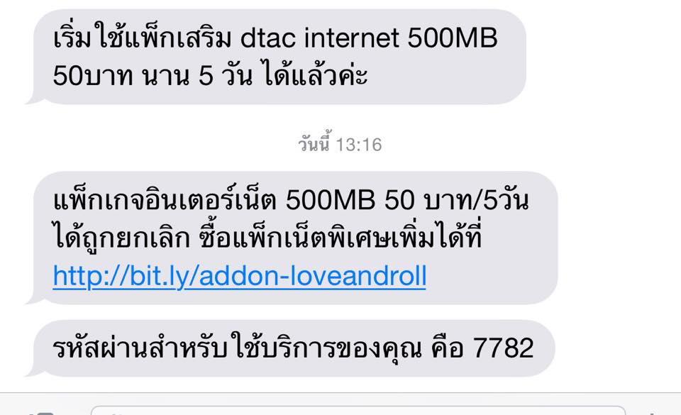 เขาเลยแนะนำให้ทดลองสมัคร แพคเกจเสริม 50 บาท 500 mb ดู ปรากฎว่าใช้ได้ทันที ตามรูป