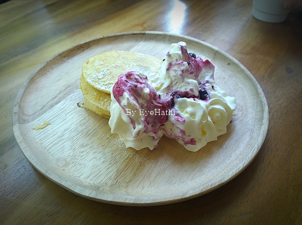 แพนเค้กกันบ้าง สั่งมาลอง 2 แบบ อย่างแรกเป็นสวีดิชแพนเค้ก วิปครีมราดด้วยบลูเบอรี่ซอส เปรี้ยวๆดีค่ะ ตัวแพนเค้กออกกระด้างหน่อยแต่ก็บางดี