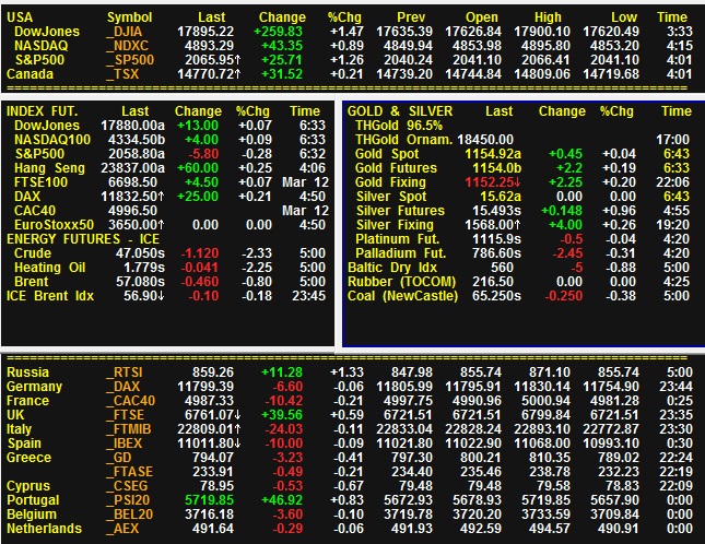 ดาวโจนส์ เพิ่มขึ้น 259.83 จุด (1.47 เปอร์เซ็นต์) ปิดที่ 17,895.22 จุด เอสแอนด์พี เพิ่มขึ้น 25.71 จุด (1.26 เปอร์เซ็นต์) ปิดที่ 2,065.95 จุด แนสแดค เพิ่มขึ้น 43.35 จุด (0.89 เปอร์เซ็นต์) ปิดที่ 4,893.29 จุด