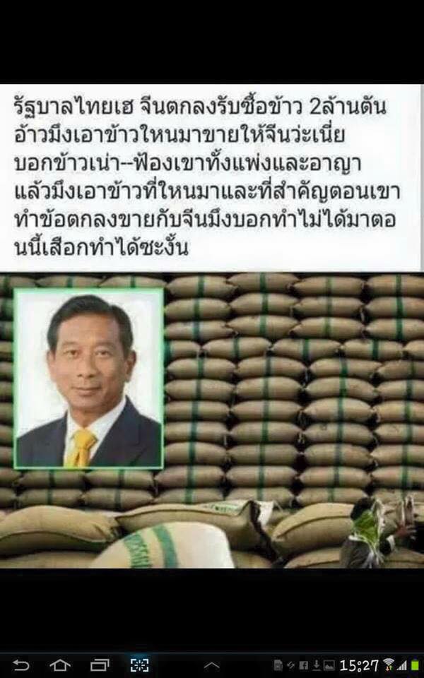 ก่อนหน้านั้น....มีข่าวว่าข้าวเสื่อมสภาพ ทานไม่ได้ มีข้าวดีแค่ 10% (1.8 ล้านตัน) แต่มาวันนี้....ข่าวระบุว่าไทยจะขายข้าวให้จีนได้ซะงั้น ประเด็นที่น่าสงสัยคือ....คนจีนจะซื้อข้าวเน่าไปทำไม? คนจีนทานข้า