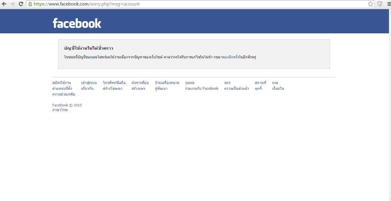 Facebook ขึ้นว่า ""บัญชีผู้ใช้ไม่พร้อมใช้งานชั่วคราว"" ""ในขณะนี้บัญชีของคุณไม่พร้อมใช้งานเนื่องจากปัญหาของเว็บไซต์ คาดว่าจะได้รับการแก้ไขในไม่ช้า กรุณาลองอีกครั้งในอีกส