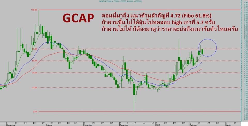 - ราคาปัจจุบันได้ขึ้นมาถึงเเนวต้านสำคัญคือ 4.72 (Fibo 61.8%) ถ้าผ่านไปได้ ก็ลุ้นทดสอบ high เดิม ที่ราคา 5.7 ครับ เเต่ถ้าผ่านไปไม่ได้ ก็มาดูว่าราคาจะย่อลงมาที่เเนวรับใด