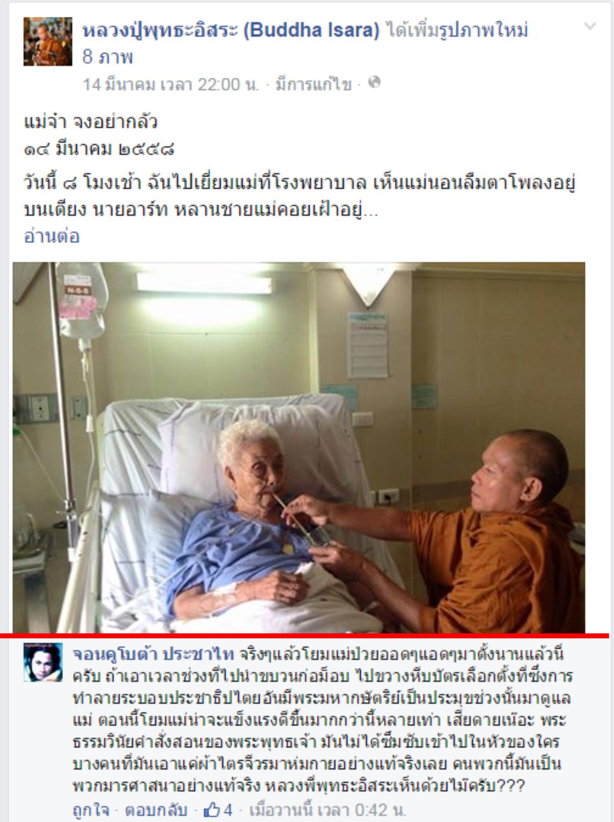 quote (from sanook web) ผู้สื่อข่าวรายงานว่า (21 ก.พ.) หลวงปู่พุทธะอิสระ แกนนำ กปปส. โพสต์ภาพผ่านเฟซบุ๊ก หลวงปู่พุทธะอิสระ (Buddha Isara) โดยเป็นภาพหลวงปู่พุทธะอิสระ ขณะนอนบนเตียงพยาบาลให้ทีมแพทย์ให