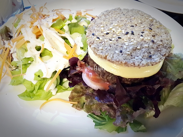 ต่อด้วยเบอร์เกอร์เห็ด ไม่มีขนมปัง เพราะงั้นแทนที่ด้วยของที่คล้ายๆแครกเกอร์ เห็นว่าทำจากถั่วล้วนๆ