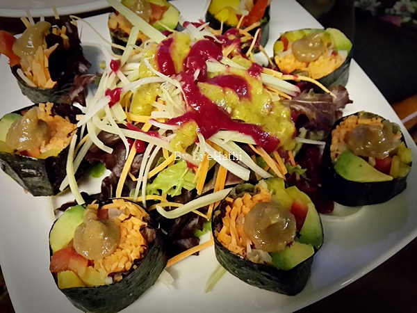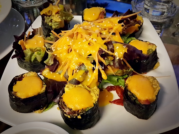 ซูชิ ด้วยความหิว ไม่ได้รอดูก่อนว่ามาแบบไหน แหะๆ สั่งไปสองเลย เป็นผักล้วนๆอันนึงราดน้ำอะไรมาไม่ทราบ (>/////<)