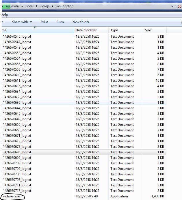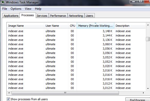 คือว่าผมไปอ่านมาครับว่ามันเป็นไวรัสชนิดหนึ่งซึ่งไม่มีผลกระทบอะไรต่อคอม แต่แค่มันกินทรัพยากรในคอมอย่างมาก อย่างในรูป โปรแกรมนึงรันตัวเองโดยใช้พื้นที่ประมาณ3000-7000Up แต่มันรันหลายตัวรวมกันเพราะฉะนั้นมันเลยทำให้คอมช้าลงไปมาก ในตอนนี้ผมกำลังเจอปัญหานี้อยู่หาวิธีแก้ในเน็ตหลายทางแล้วแต่ก็หาไม่เจอ ใครมีวิธีแก้หรือลบไอ Indexer.exeนี่ออกไปจากคอมบ้างครับผมหมดทางแก้ละ 555555 เบื่อกับมันสุดๆลบออกไปหลายรอบก็กลับมาประจำ
