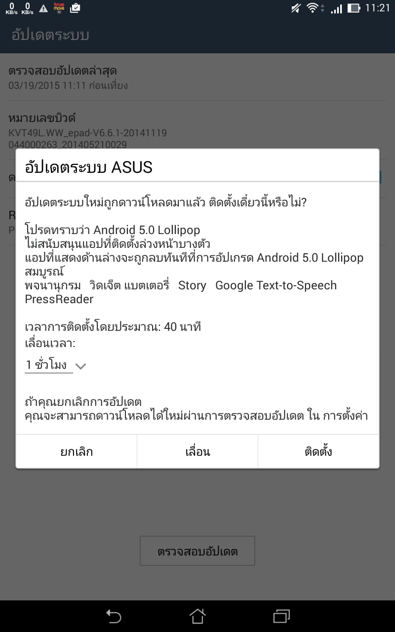 คือ ผมใช้ Asus fonepad 7 hd มา 2 ปี แหละ คราวที่แล้ว ได้กิน kitkat 4.4.2 กะเค้าก็ถือว่า มาไกลแล้ว นี่ได้มาถึง Lollipop 5.0 ถือว่า สุดๆแหละ ขอบคุณ Asus ที่ให้เครื่องรุ่นเก่าอย่างผมยังได้ลองเล่นอะไรใหม่ กับ เวอร์ชั่นใหม่นะครับ