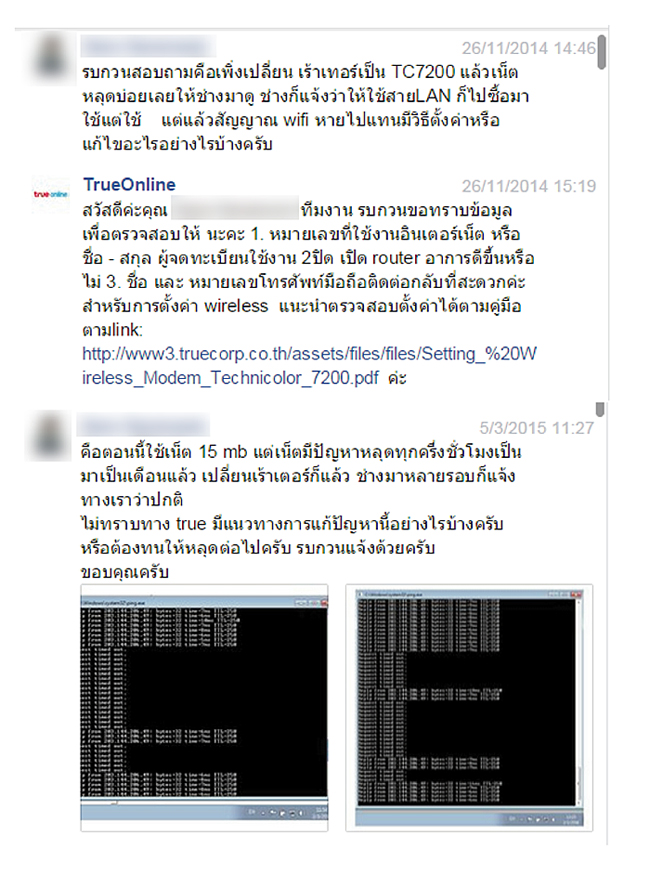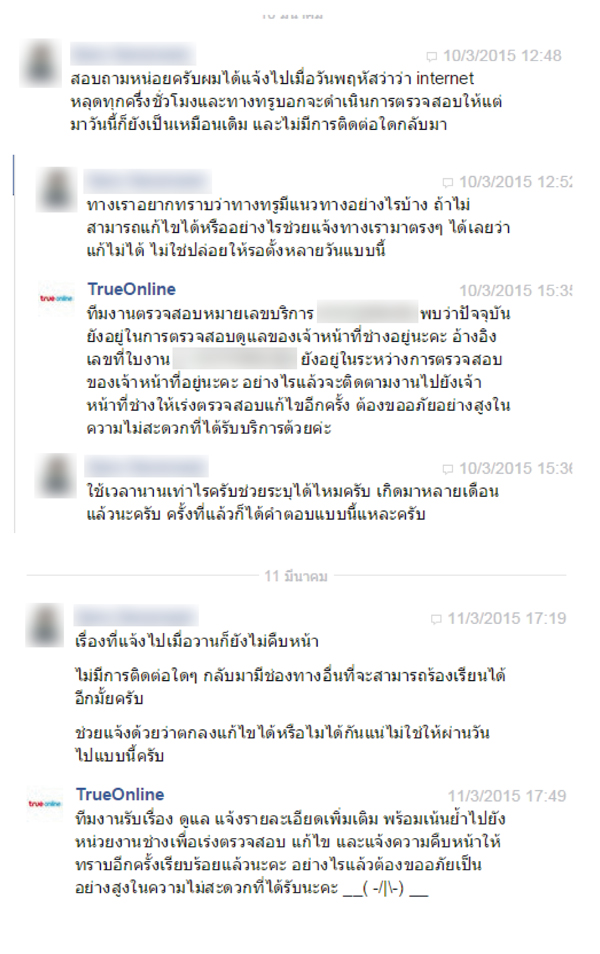 โทรแจ้งเป็น 10 ครั้ง บอกจะติดต่อกลับก็เงียบหายไป เลยเปลี่ยนช่องทางใหม่ทาง facebook บ้าง แต่ทรูทำได้แค่รับเรื่องแบบเดิมๆ